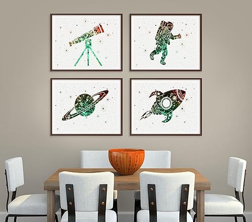 Amazon Com Space Art Watercolor Astronaut Rocket Saturn Telescope