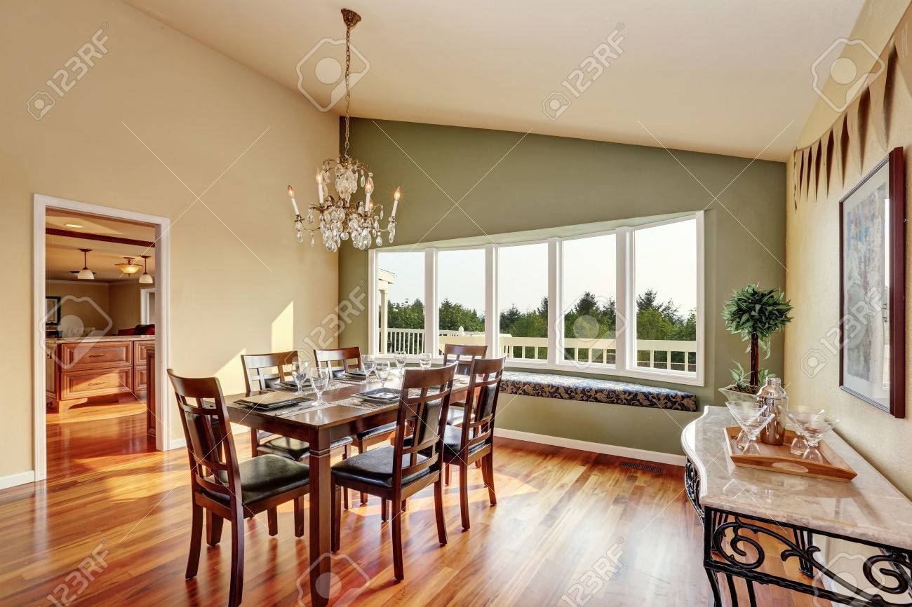 Elegant Dining Room With Contrast Olive Wall Vaulted Ceiling