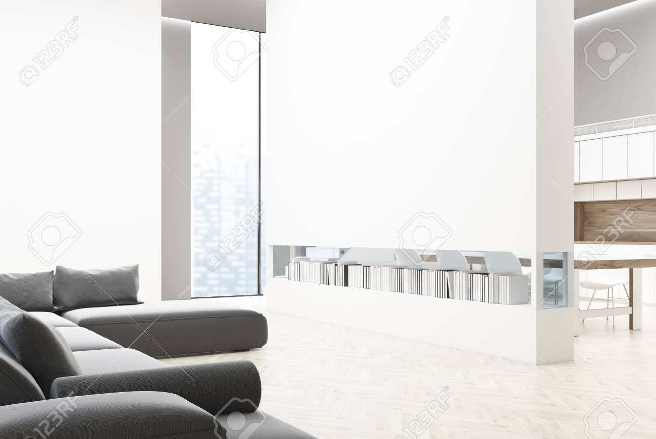 White Brick Wall Living Room With A Gray Sofa And Poufs A