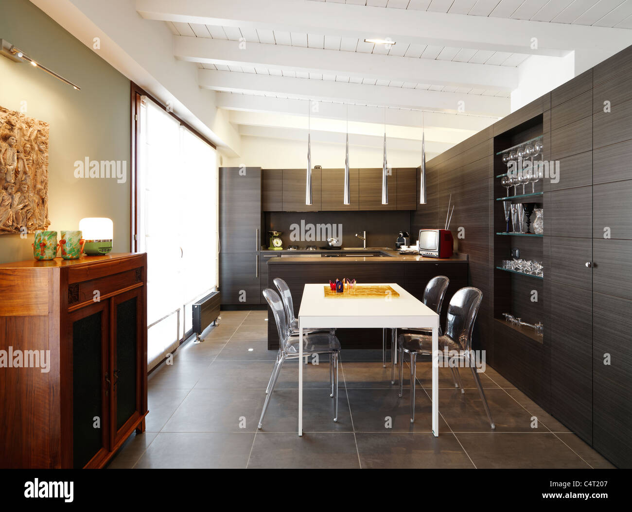 Modern Dining Room And Kitchen In The Attic With Wood Wainscoting