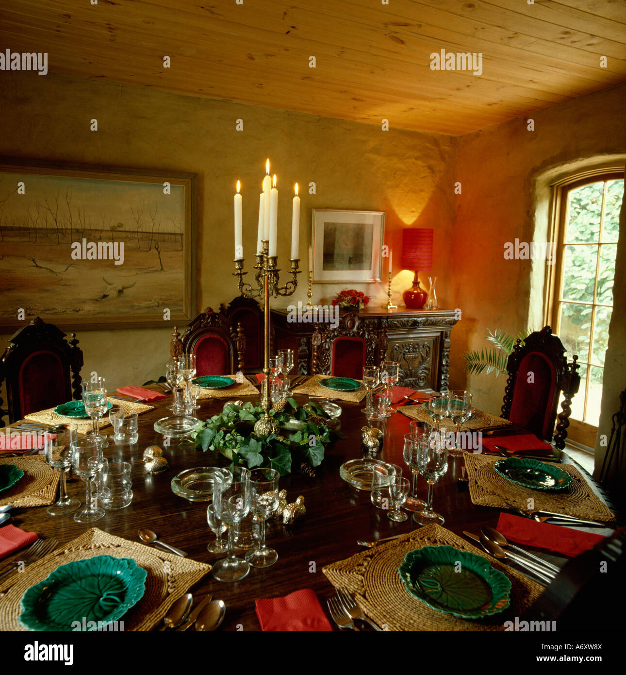Dining Table With Green Plates And Red Napkins In French Country