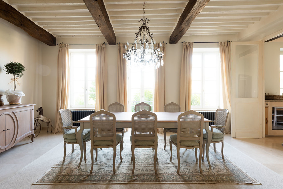 The primary characteristics of the shabby chic decor style are casualness and simplicity. This style may be combined with romantic provence or with rustic for a dining room if the designer adds some rough wooden pieces.