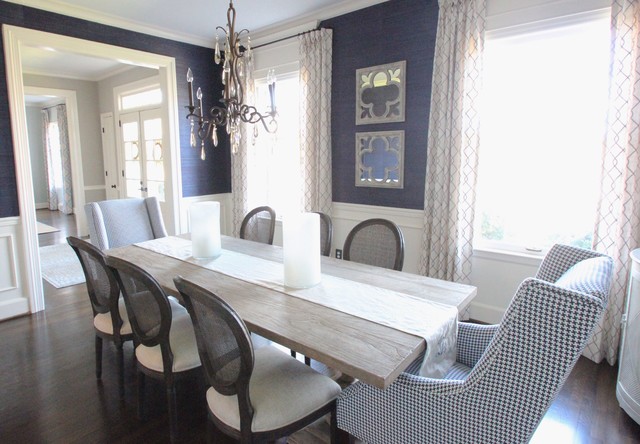 Transitional Dining Room Features Upper Walls Clad In Gray