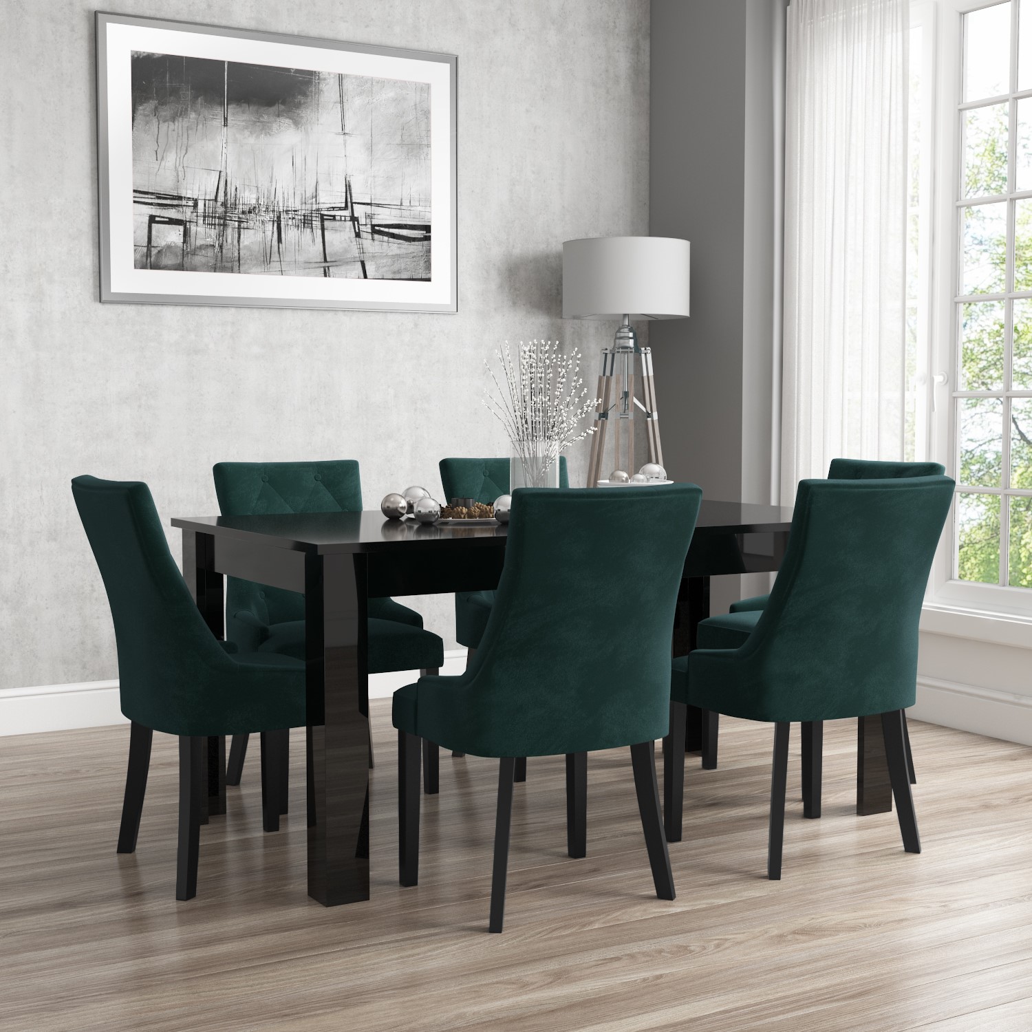 Extendable Dining Table In Black High Gloss With 6 Green Velvet