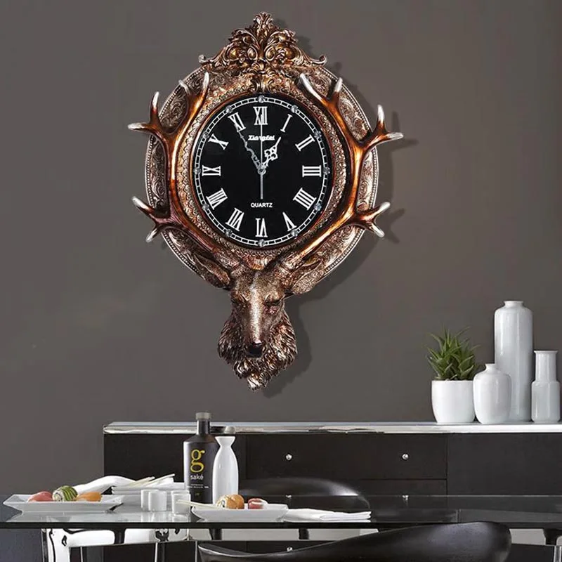 European Style Hanging Clock Natural Resin Big Deer Head Wall