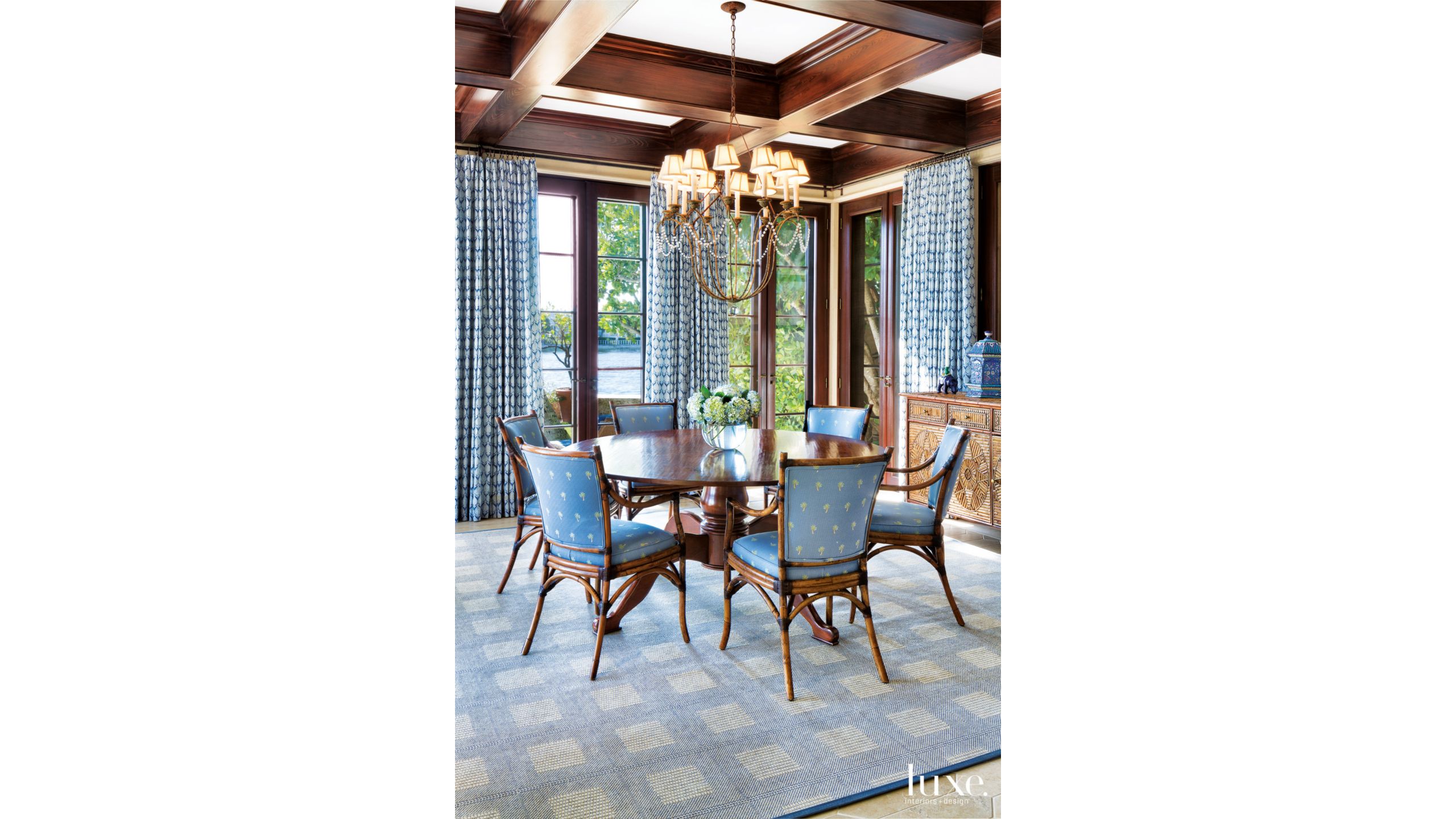 Traditional Blue Guesthouse Dining Room With Coffered Ceiling