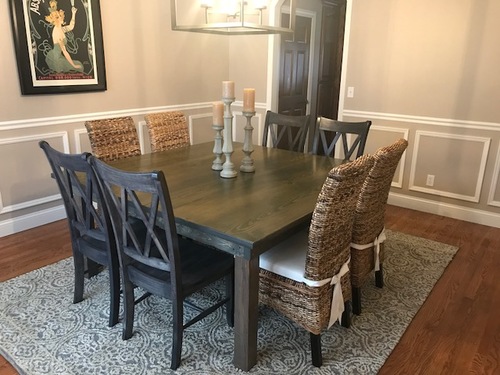 Gray Farmhouse Dining Table With Black Wood Vintage Chairs